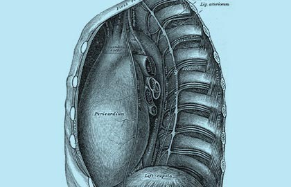 The mediastinum is a group of structures in the middle of chest. It incudes the heart, the large blood vessels to and from the heart, the oesophagus, the trachea (wind pipe), nerves, the thymus and lymph nodes.