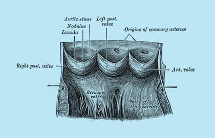 The aortic valve controls blood flow between the left ventricle and the aorta, the artery that delivers oxygen-rich blood to the body. There are two main problems that can occur with the aortic valve: it can become hardened and narrowed (stenosis), or it can leak (regurgitation). The most common problem in the elderly is called age-related calcific degeneration, where the gradual buildup of calcium causes the valve to narrow. In younger patients a bicuspid valve (two leaflets instead of three) is a common cause. Symptoms of aortic stenosis include light-headedness, chest pain, shortness of breath and fatigue.